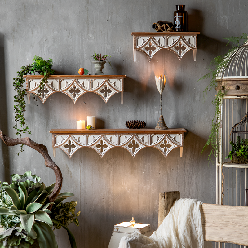 Handcrafted Rustic Wooden Wall Shelf – Vintage Carved Wall Décor for Living Room, Kitchen, or Café