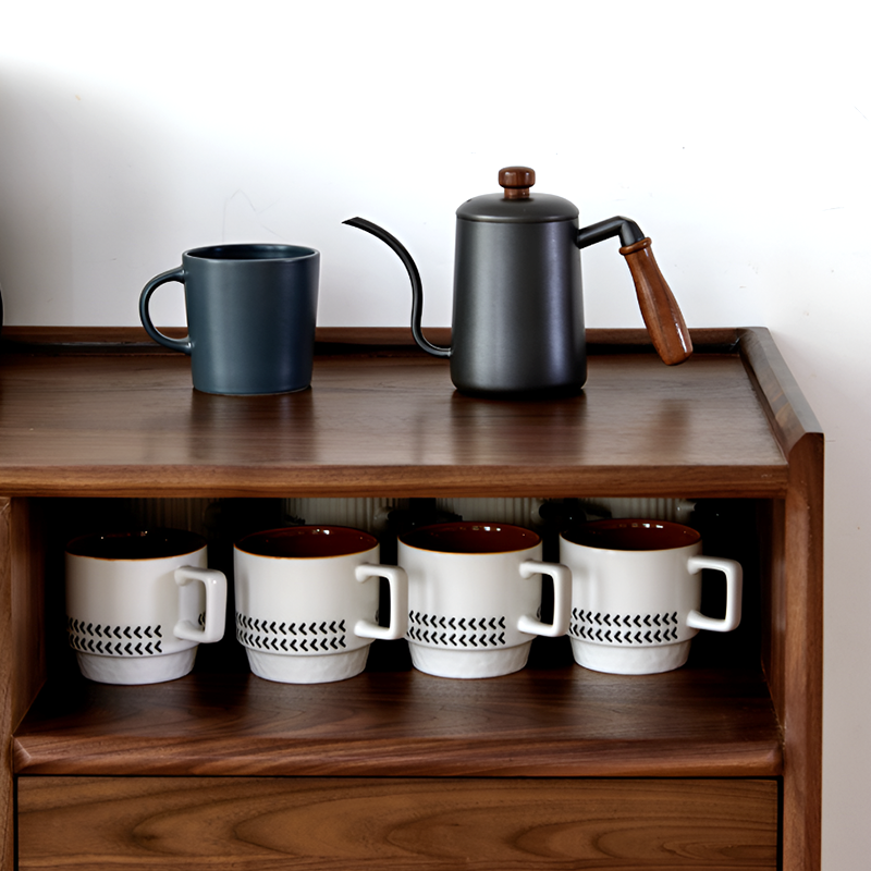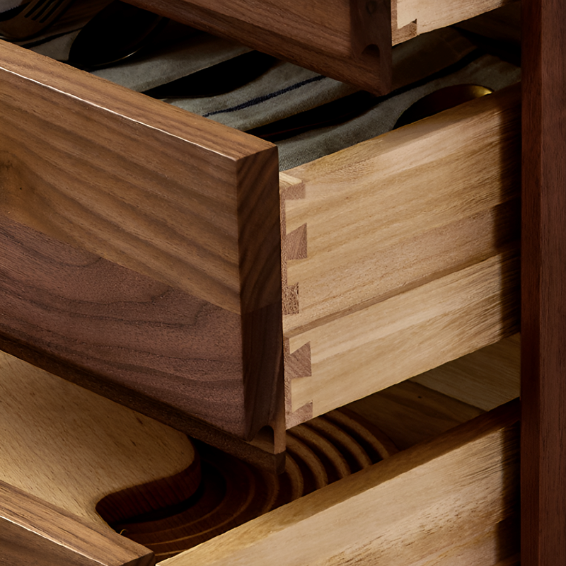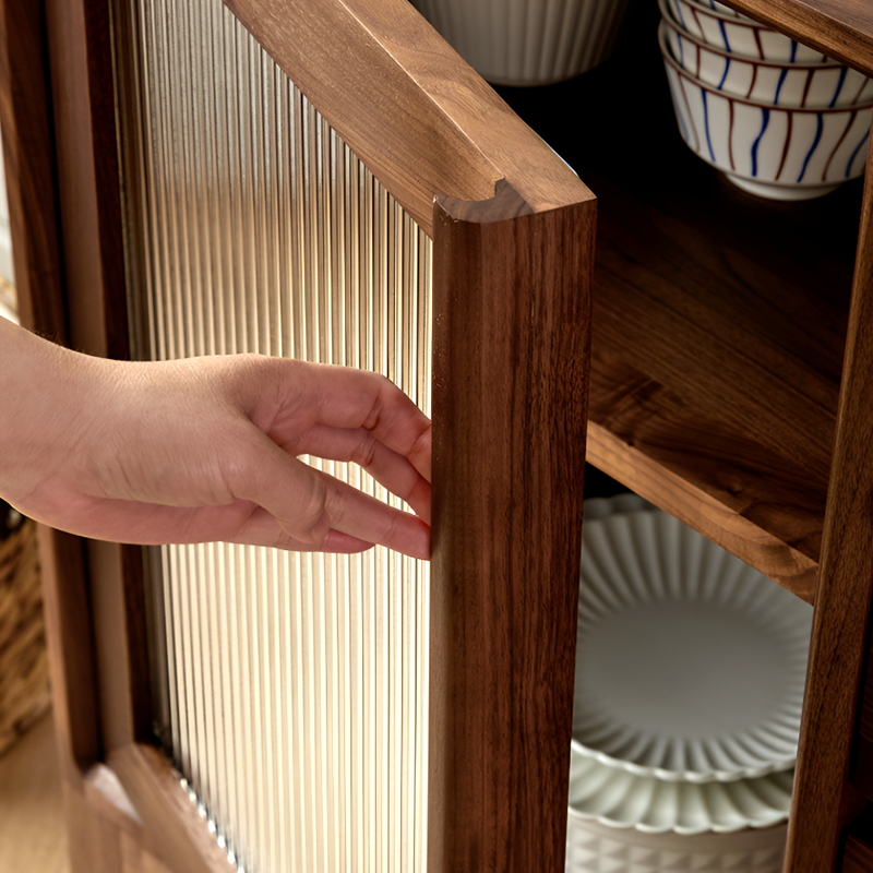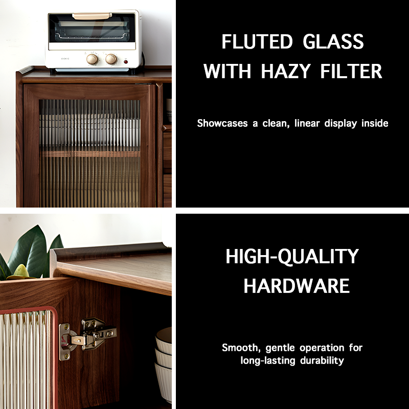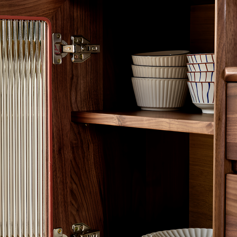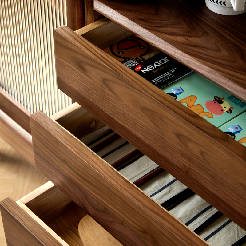 This North American Black Walnut Solid Wood Sideboard is crafted from premium hardwood and designed in a sleek Scandinavian style. The rich walnut grain, paired with smooth drawers and a fluted glass door, creates both beauty and practicality. With multiple compartments for storage, it’s perfect for organizing tableware, tea sets, or everyday household items. Built to last, this cabinet combines durability, functionality, and modern design, making it a versatile addition to any living room or dining space.