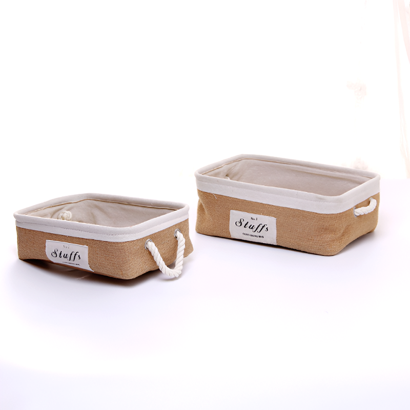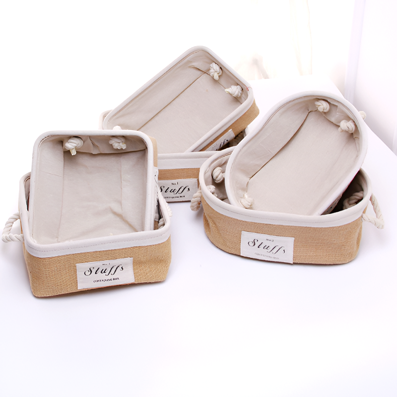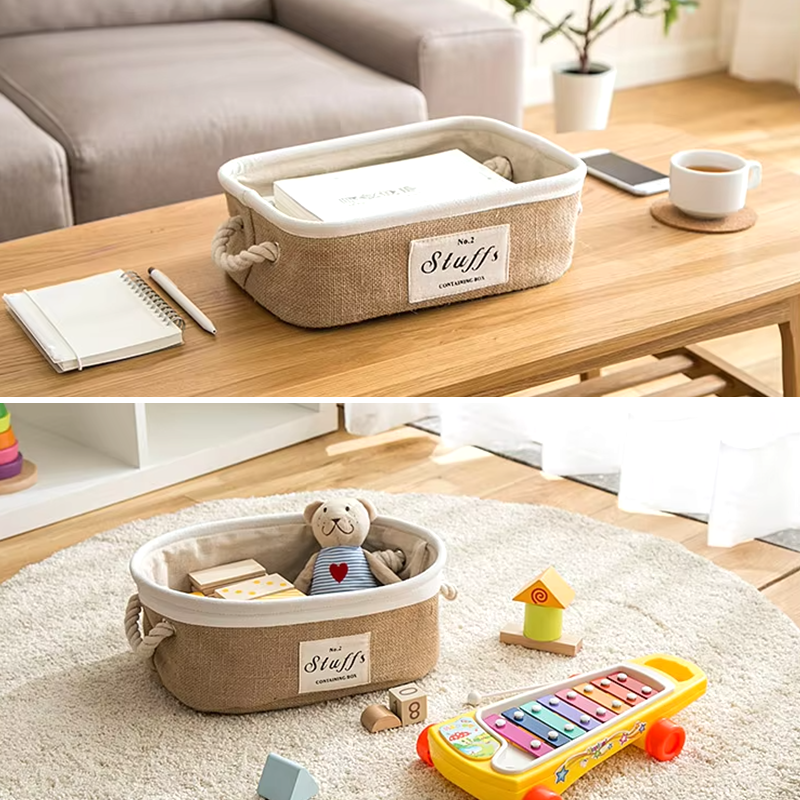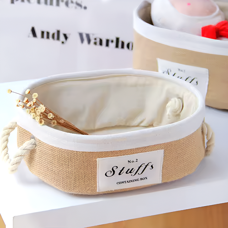 These Eco-Friendly Jute Storage Baskets are crafted with a natural jute exterior, soft cotton lining, and a durable EVA middle layer for added structure. Equipped with sturdy hemp rope handles, they are lightweight, portable, and perfect for organizing small household items.