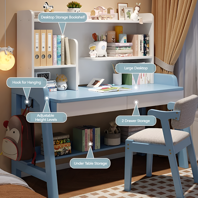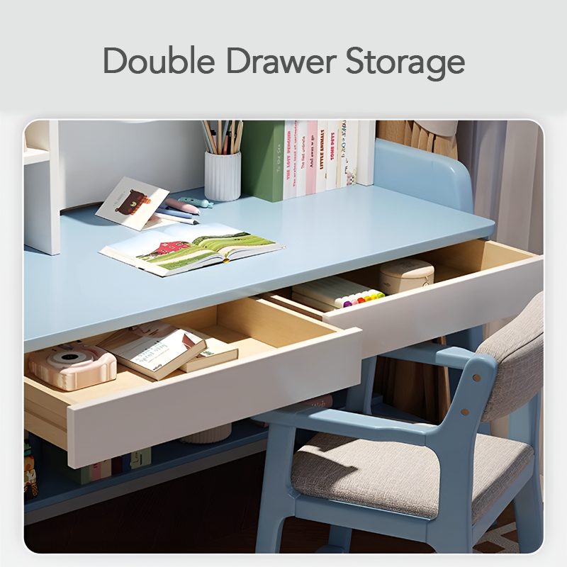 Create the perfect study space for your child with this premium Solid Wood Kids Study Desk and Chair Set. Featuring a built-in bookshelf, two smooth-glide storage drawers, and a spacious desktop, this desk is designed to keep learning organized and inspiring. The adjustable-height design grows with your child, while the sturdy construction and rounded corners ensure long-term durability and safety. Available in five charming colors, this desk-and-chair combo fits beautifully in any bedroom or study area.